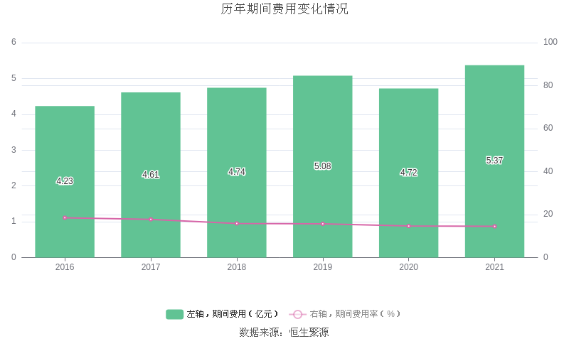 2021年全年,公司期间费用为5.37亿元,较上年增加6521.36万元;但期间费用率为14.53%,较上年下降0.15个百分点。