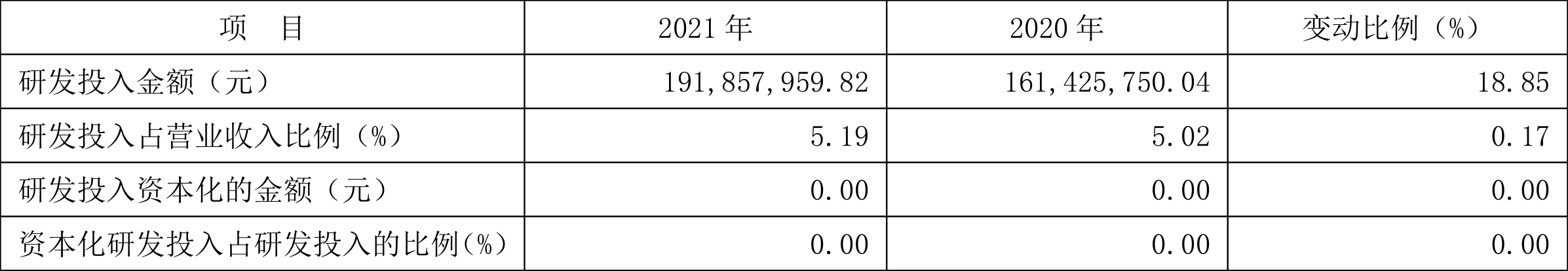 2021年全年,公司研发投入金额为1.92亿元,同比增长18.85%;研发投入占营业收入比例为5.19%,相比上年同期上升0.17个百分点。此外,公司全年研发投入资本化率为0。