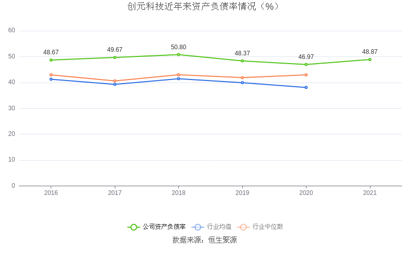 在偿债能力方面,公司2021年末资产负债率为48.87%,相比上年同期上升1.90个百分点,近年来整体高于行业均值。