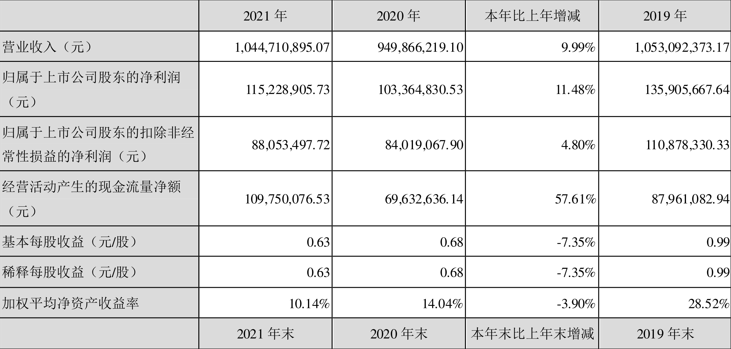 中证财讯 瑞鹄模具(002997)4月12日披露2021年年度报告。2021年,公司实现营业收入10.45亿元,同比增长9.99%;归母净利润1.15亿元,同比增长11.48%;扣非净利润8805.35万元,同比增长4.80%;经营活动产生的现金流量净额为1.10亿元,同比增长57.61%;基本每股收益为0.63元,加权平均净资产收益率为10.14%。拟向全体股东每10股派2元(含税)。
