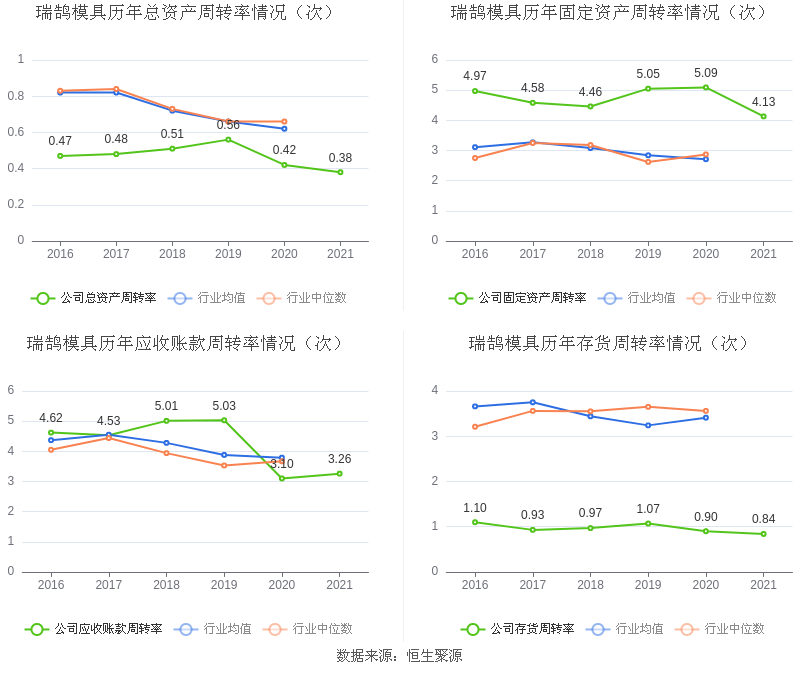 营运能力方面,2021年,公司总资产周转率为0.38次,上年同期为0.42次(2020年行业平均值为0.62次,公司位居同行业31/38);固定资产周转率为4.13次,上年同期为5.09次(2020年行业平均值为2.71次,公司位居同行业7/38);公司应收账款周转率、存货周转率分别3.26次、0.84次。