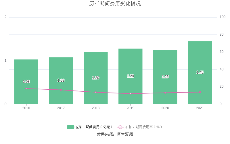 2021年全年,公司期间费用为1.45亿元,较上年增加2053.35万元;期间费用率为13.91%,较上年上升0.78个百分点。