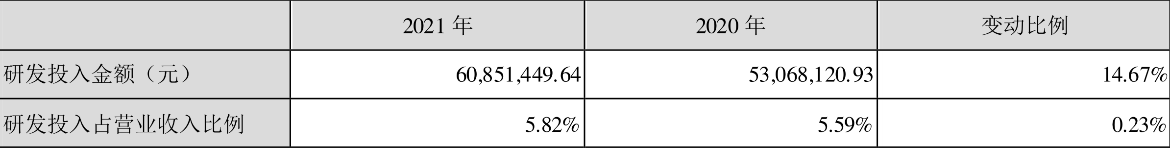 2021年全年,公司研发投入金额为6085.14万元,同比增长14.67%;研发投入占营业收入比例为5.82%,相比上年同期上升0.23个百分点。此外,公司全年研发投入资本化率为0。