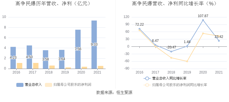 数据统计显示,高争民爆近三年净利润复合年增长率为-4.51%,在民爆制品行业已披露2021年数据的6家公司中排名第5。