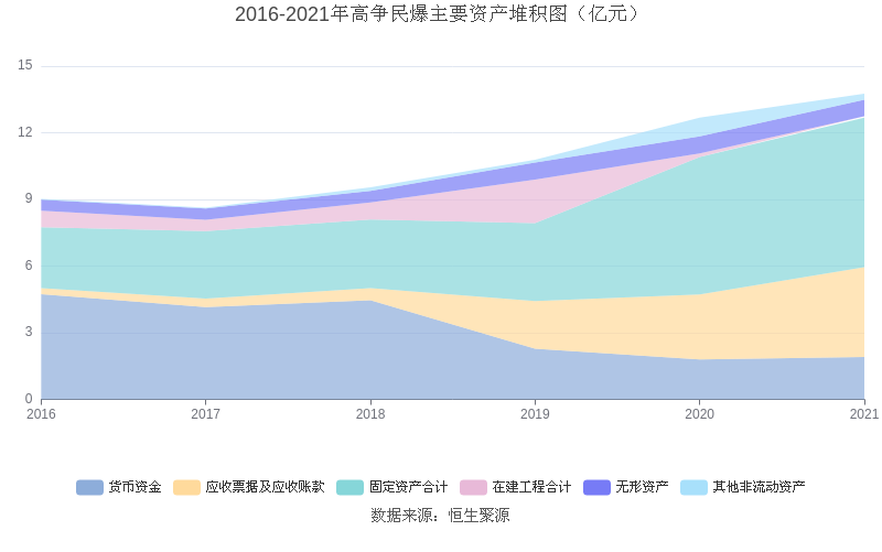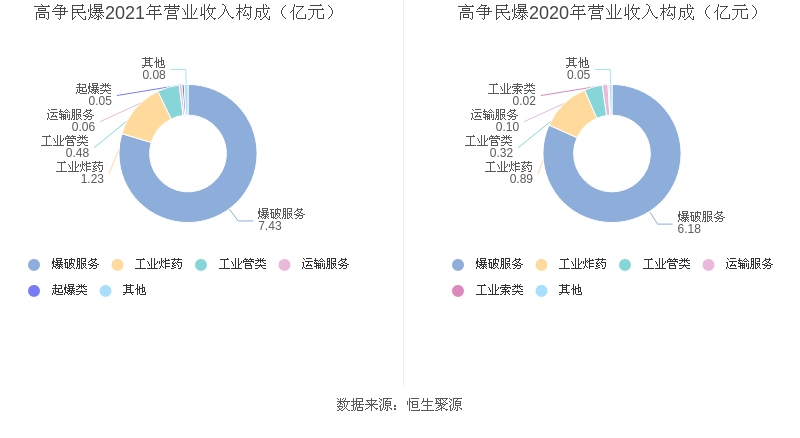 2021年度公司主营业务中,爆破服务收入7.43亿元,占营业收入的79.64%,同比增长20.18%;工业炸药收入1.23亿元,占营业收入的13.16%,同比增长37.85%;工业管类收入0.48亿元,占营业收入的5.15%,同比增长51.51%。
