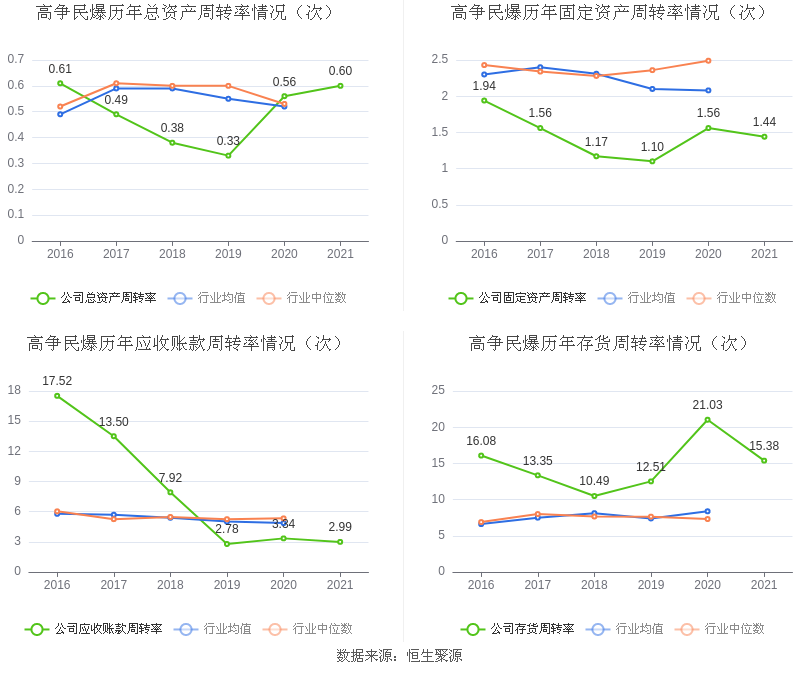 营运能力方面,2021年,公司总资产周转率为0.60次,上年同期为0.56次(2020年行业平均值为0.52次,公司位居同行业6/13);固定资产周转率为1.44次,上年同期为1.56次(2020年行业平均值为2.08次,公司位居同行业11/13);公司应收账款周转率、存货周转率分别2.99次、15.38次。
