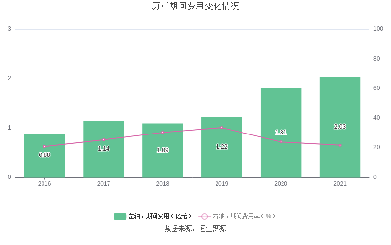2021年全年,公司期间费用为2.03亿元,较上年增加2182.65万元;但期间费用率为21.72%,较上年下降2.20个百分点。