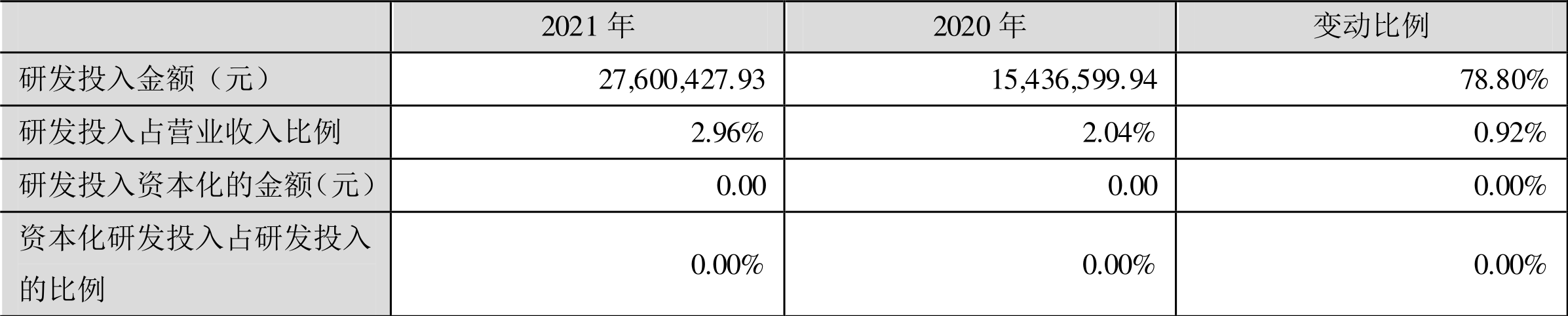 2021年全年,公司研发投入金额为2760.04万元,同比增长78.80%;研发投入占营业收入比例为2.96%,相比上年同期上升0.92个百分点。此外,公司全年研发投入资本化率为0。