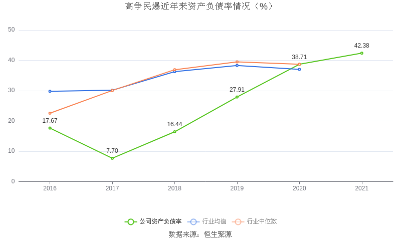 在偿债能力方面,公司2021年末资产负债率为42.38%,相比上年同期上升3.67个百分点,处于行业平均水平。