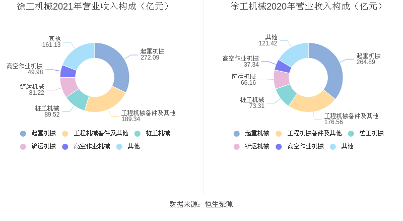 2021年度公司主营业务中,起重机械收入272.09亿元,占营业收入的32.27%,同比增长2.72%;工程机械备件及其他收入189.34亿元,占营业收入的22.45%,同比增长7.24%;桩工机械收入89.52亿元,占营业收入的10.62%,同比增长22.11%。