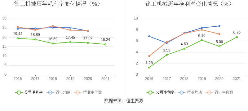 2021年,公司毛利率为16.24%,同比下降0.83个百分点;净利率为6.70%,较上年同期上升1.63个百分点。值得关注的是,近年来公司毛利率、净利率均长期低于行业平均水平。