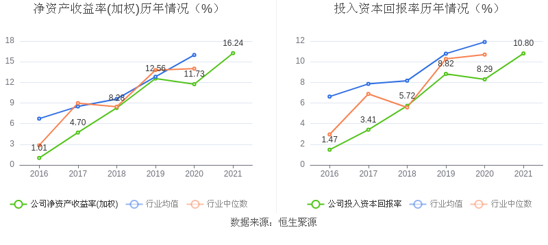 数据显示,2021年公司加权平均净资产收益率为16.24%,较上年同期增长4.51个百分点,长期低于行业平均;公司2021年投入资本回报率为10.80%,较上年同期增长2.51个百分点。