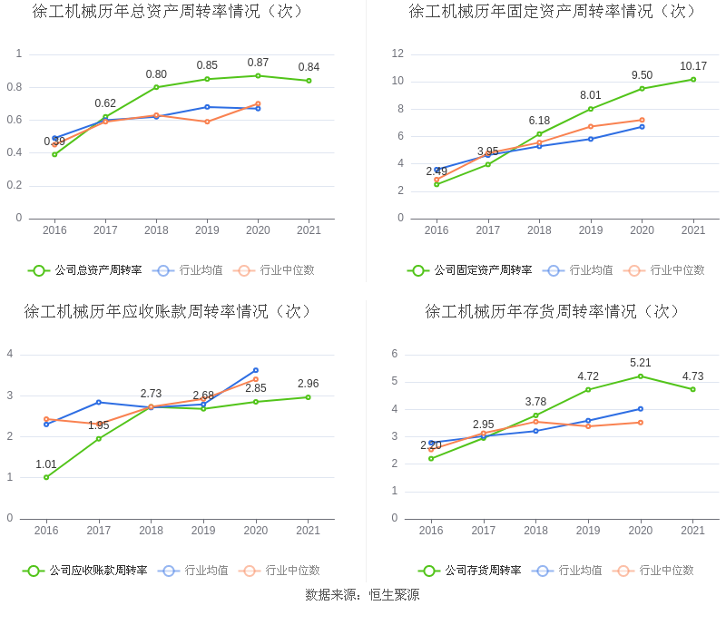 营运能力方面,2021年,公司总资产周转率为0.84次,上年同期为0.87次(2020年行业平均值为0.67次,公司位居同行业5/19);固定资产周转率为10.17次,上年同期为9.50次(2020年行业平均值为6.71次,公司位居同行业4/19);公司应收账款周转率、存货周转率分别2.96次、4.73次。