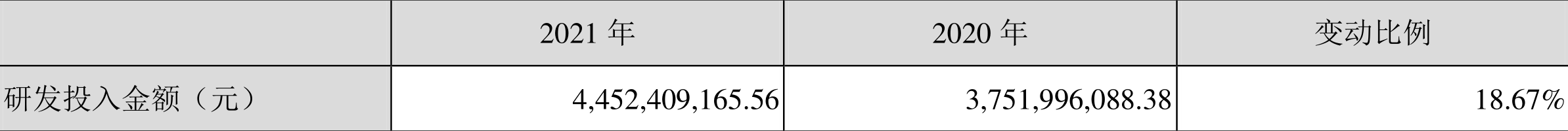 2021年全年,公司研发投入金额为44.52亿元,同比增长18.67%;研发投入占营业收入比例为5.28%,相比上年同期上升0.21个百分点。此外,公司全年研发投入资本化率为17.45%。