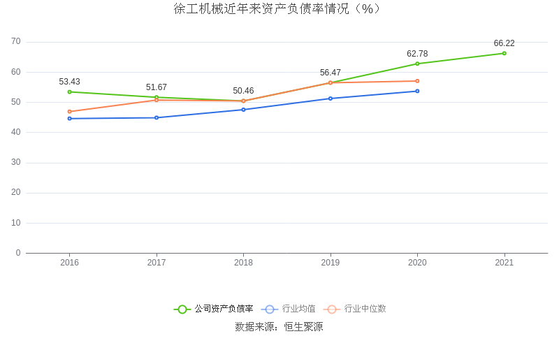 在偿债能力方面,公司2021年末资产负债率为66.22%,相比上年同期上升3.44个百分点,近年来整体高于行业均值。