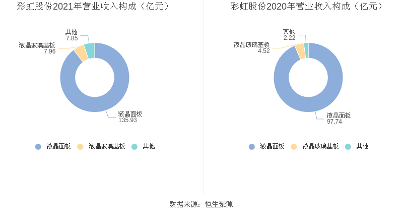 2021年度公司主营业务中,液晶面板收入135.93亿元,占营业收入的89.59%,同比增长39.08%;液晶玻璃基板收入7.96亿元,占营业收入的5.24%,同比增长75.99%;其他业务收入7.85亿元,占营业收入的5.17%,同比增长253.65%。
