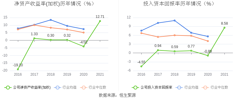 数据显示,2021年公司加权平均净资产收益率为12.71%,较上年同期增长16.73个百分点,长期低于行业平均;公司2021年投入资本回报率为8.58%,较上年同期增长9.47个百分点。