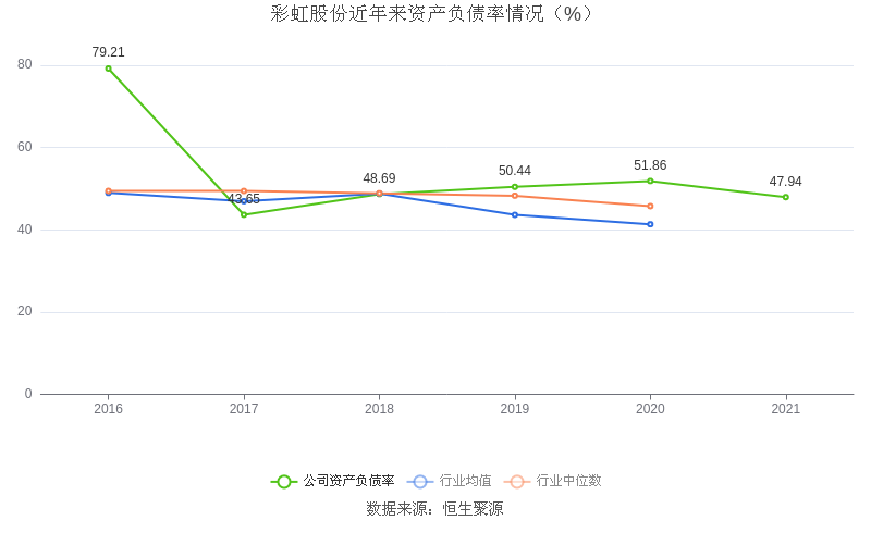 在偿债能力方面,公司2021年末资产负债率为47.94%,相比上年同期下降3.92个百分点,处于行业平均水平。