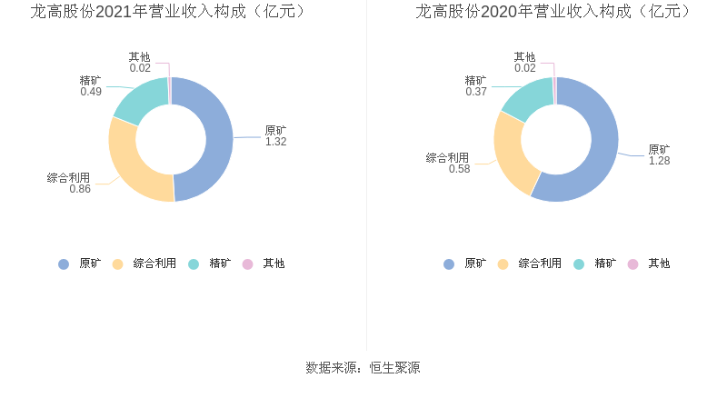 2021年度公司主营业务中,原矿收入1.32亿元,占营业收入的49.03%,同比增长2.63%;综合利用收入0.86亿元,占营业收入的32.16%,同比增长49.78%;精矿收入0.49亿元,占营业收入的18.22%,同比增长33.33%。