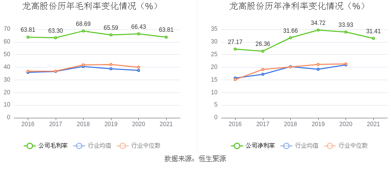 2021年,公司毛利率为63.81%,同比下降2.62个百分点;净利率为31.41%,较上年同期下降2.52个百分点。值得一提的是,近年来公司毛利率、净利率均持续高于行业平均水平。