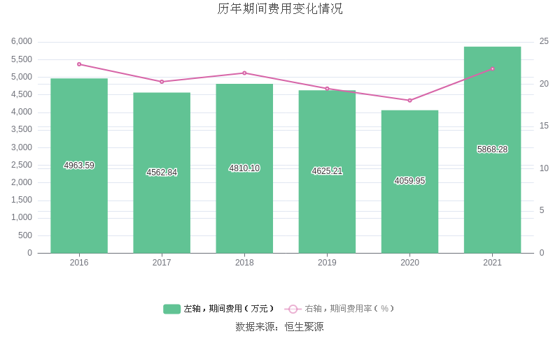 2021年全年,公司期间费用为5868.28万元,较上年增加1808.33万元;期间费用率为21.82%,较上年上升3.74个百分点。