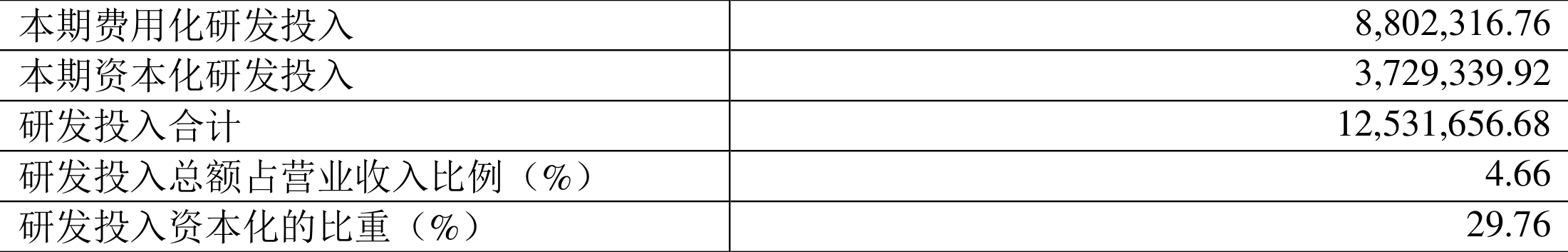 2021年全年,公司研发投入金额为1253.17万元;研发投入占营业收入比例为4.66%。此外,公司全年研发投入资本化率为29.76%。