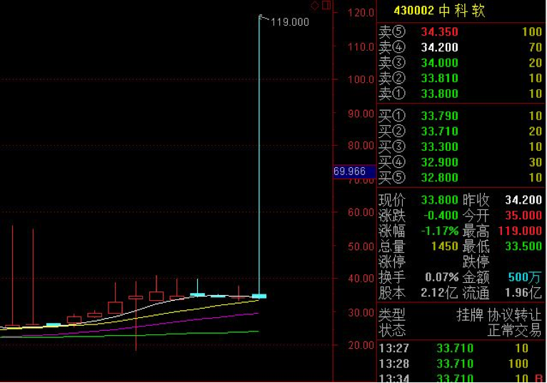 无独有偶,26日,协议转让活跃的中科软当日成交记录中也出现了一笔价格高达119元的成交,而当日其他交易的成交价格则稳定在33.5至35元之间。经查询,该笔交易的买卖双方同为华泰证券张家港杨舍东街证券营业部,且买卖双方证券账户名称均为徐彬。但若凭以上逻辑推断,孤零零的一笔高价成交似乎很难撬动一直以来成交活跃的中科软股价。
