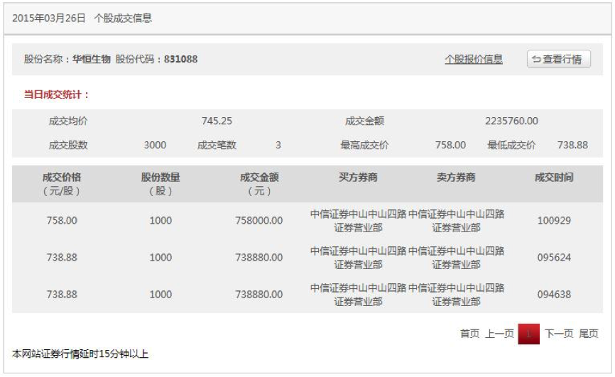 758元!这是3月26日华恒生物(831088)当日仅有的三笔协议成交中的一笔成交价,其余两笔的成交价也都超过了700元。而就在一天前的25日,华恒生物的协议成交价尚为158.88元。经查询全国中小企业股份转让系统网站,新三板论坛发现,华恒生物当日三笔交易的买卖双方均为中信证券中山市中山四路证券营业部。