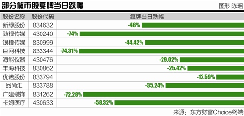 今年6月份以来,新绿股份(834632)、随视传媒(430240)、银橙传媒(830999)、巨网科技(833344)、海能仪器(430476)、丰海科技(830862)、优诺股份(833794)、品尚汇(833788)、广建装饰(831262)、卡姆医疗(430633)等三板做市股纷纷出现复牌即暴跌的情况。