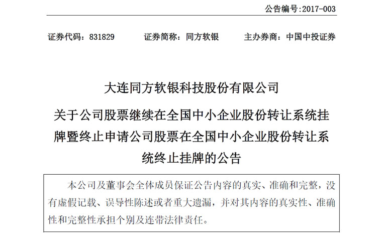 1月17日,新三板企业同方软银(831829)发布了一则《继续挂牌暨终止公司股票终止挂牌公告》。这则乍一读有些绕口的公告标题,成就了新三板上又一个“第一”——新三板第一家在宣布摘牌后又“反悔”,想要继续挂牌的企业。