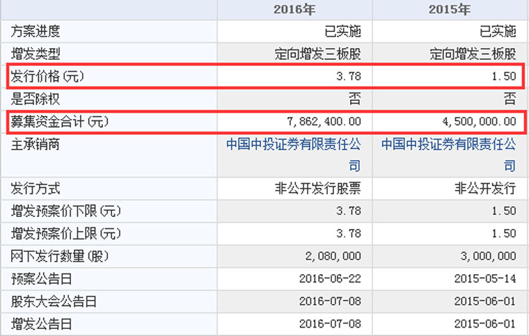 挂牌后,同方软银除了业绩连年上涨之外,在融资方面也是毫不含糊:2015年5月,公司挂牌4个月后即发布了第一份股票发行方案,公司以1.5元/股的价格,发行300万股,募集资金450万元;2016年9月,公司完成第二次股票发行,以3.78元/股的价格发行208万股,共募集资金786.24万元。
