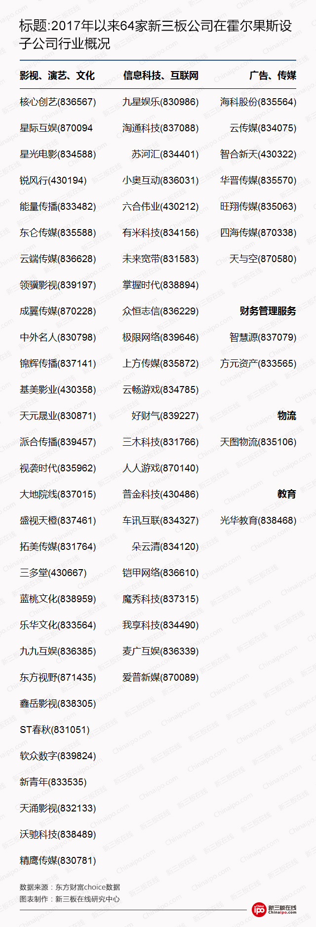 新三板在线统计发现,演艺文化类、信息技术类、广告传媒类等领域的公司最为集中。具体来看,从事影视、演艺、文化类的公司多达30家,从事信息系科技、互联网行业的公司也有23家,从事广告、传媒行业的公司是7家。