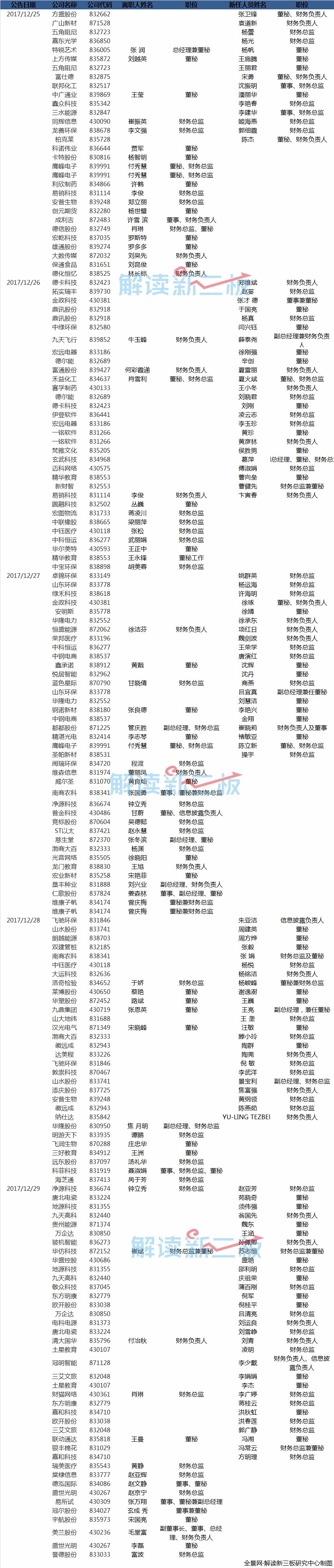 12月25日-12月29日,新三板共发布170份董事会秘书/信息披露负责人、财务总监/财务负责人变动公告,具体涉及136家挂牌公司。