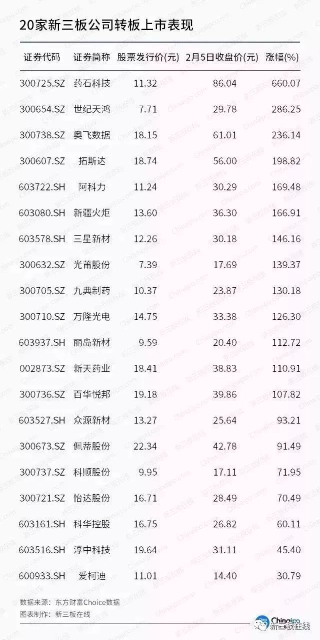 值得关注的是,在20家成功转板企业背后的投资机构中,九鼎投资等5家投资机构浮盈超10倍,约22家投资机构浮盈超亿元。