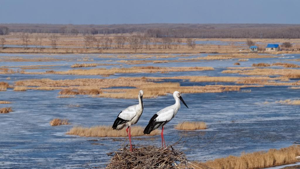 新华社长春4月6日电(记者唐成卓)春风拂过松嫩平原,这里陆续迎来一批批北迁候鸟。在位于吉林省白城市镇赉县的莫莫格国家级自然保护区,广阔的湿地生机勃勃:成千上万只大雁掠过天际、白鹤成群在浅滩信步、东方白鹳衔枝修葺旧巢……