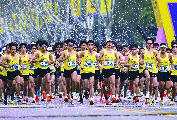 2026武汉马拉松比赛选手在“花雨”中奔跑。新华社记者肖艺九 摄