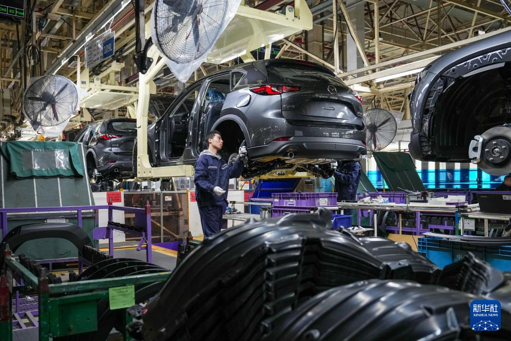 3月17日,在位于南京市江宁开发区的长安马自达汽车有限公司总装车间内,工人在生产线上进行生产作业。