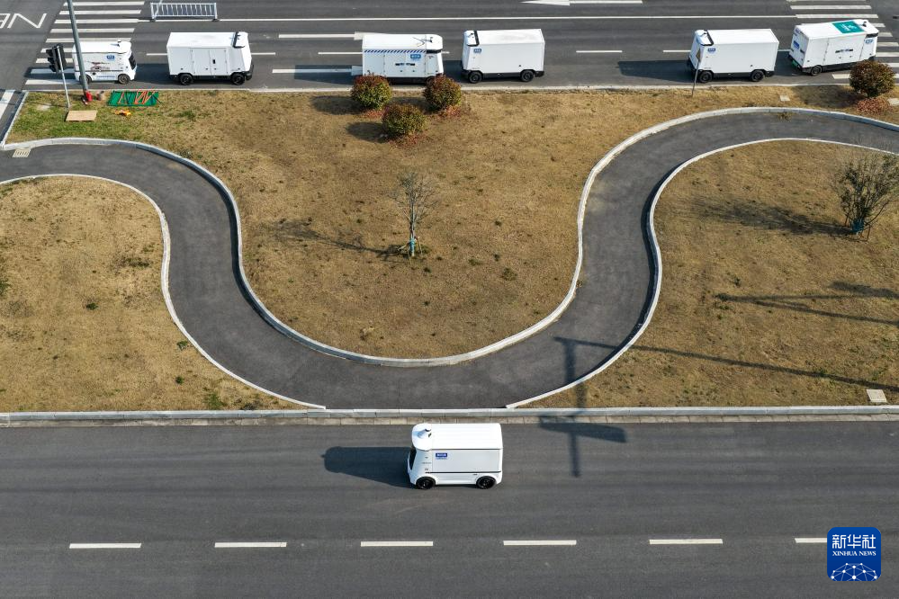 在新石器(盐城)智能制造有限公司,无人车在模拟道路测试场地进行测试(3月25日摄,无人机照片)。