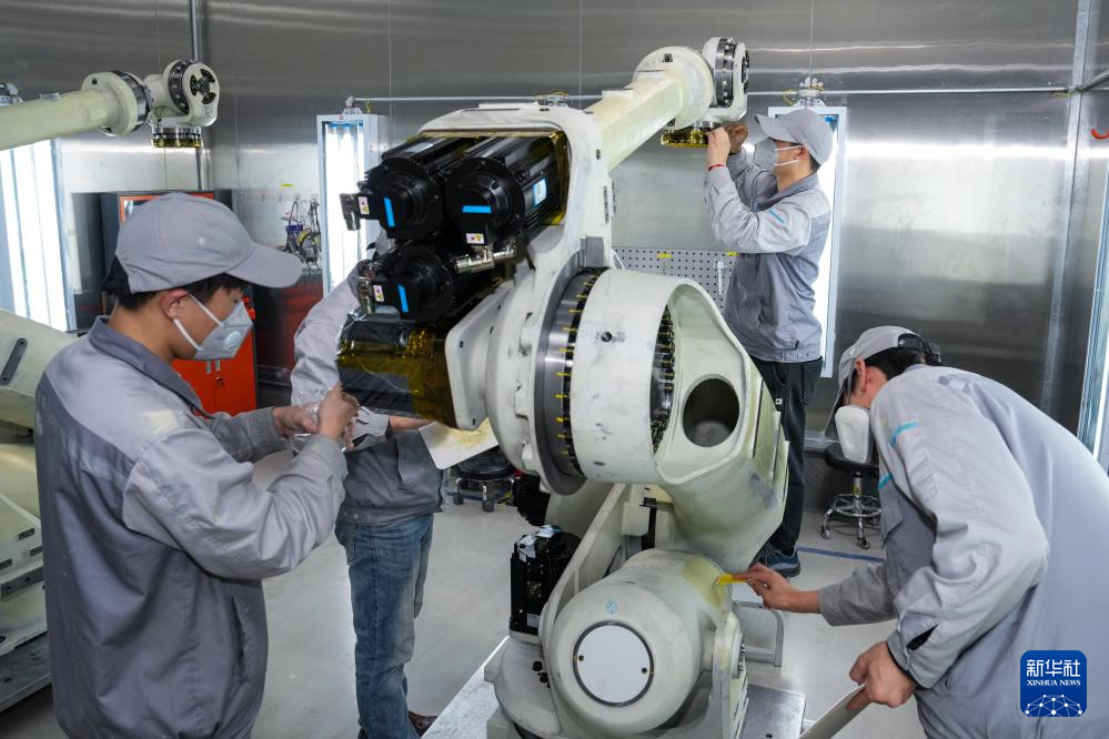 3月17日,在位于南京市江宁开发区的汇川技术南京基地自动化车间内,工作人员在多关节机器人产线上作业。