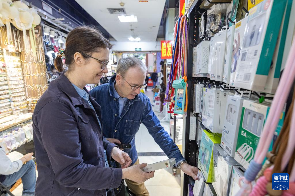 4月22日,在重庆市渝中区新重庆国际小商品批发中心,来自法国的一对夫妇在选购充电宝。