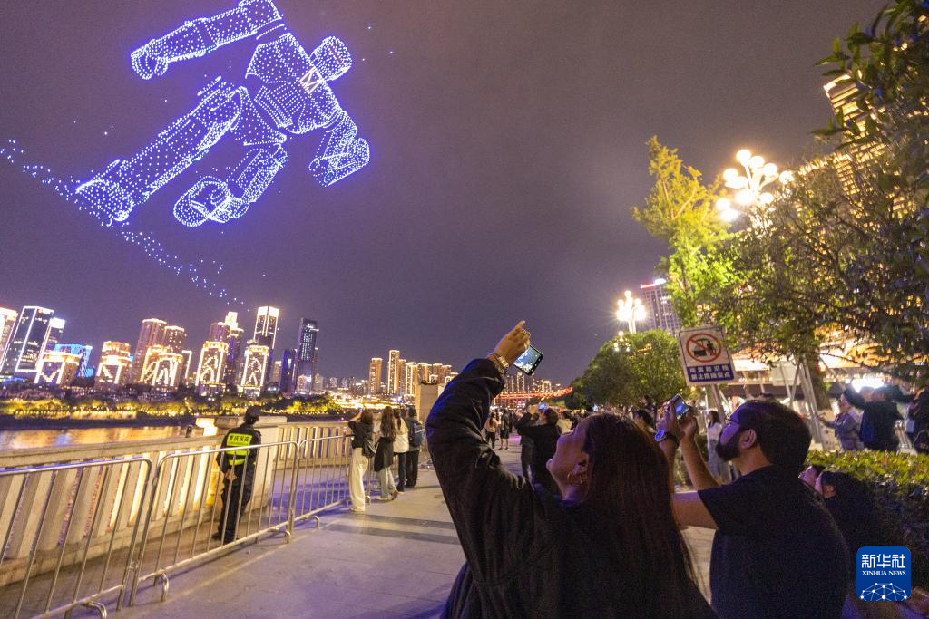 4月22日,外籍游客在重庆市南岸区南滨路拍摄无人机灯光秀表演。