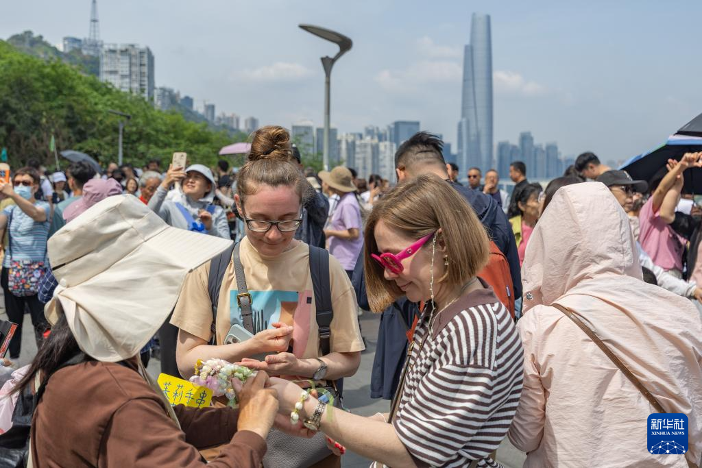 4月23日,在重庆市渝中区李子坝观景平台,外籍游客购买茉莉花手串。