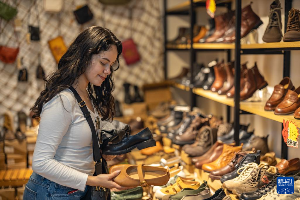 4月22日,在重庆市渝中区新重庆国际小商品批发中心,来自墨西哥的游客在选购女鞋。