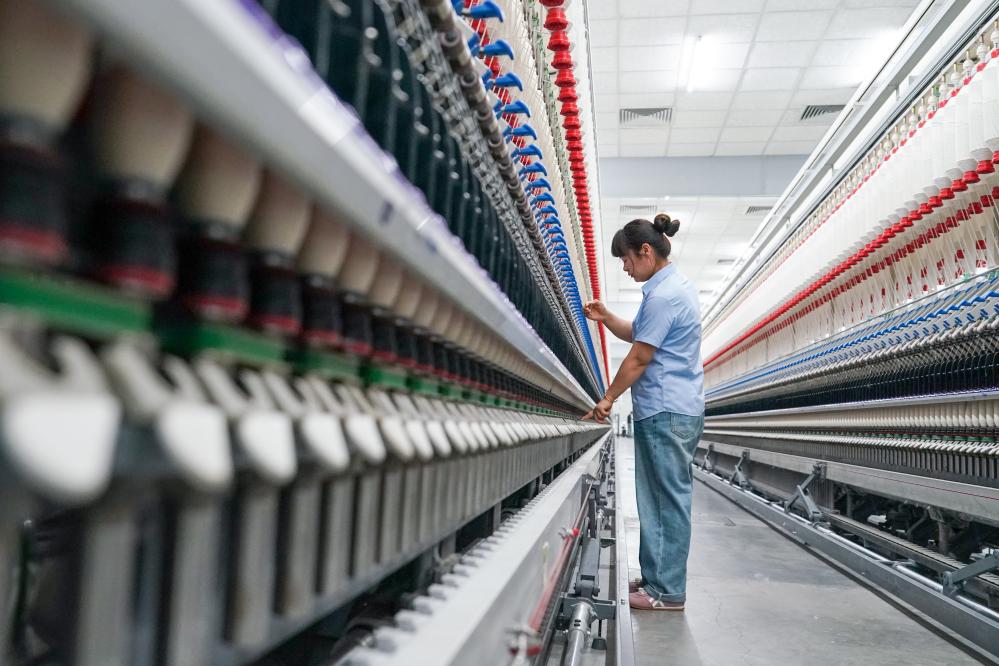 工人在江苏悦达纺织集团智能生产车间工作。新华社记者李博摄