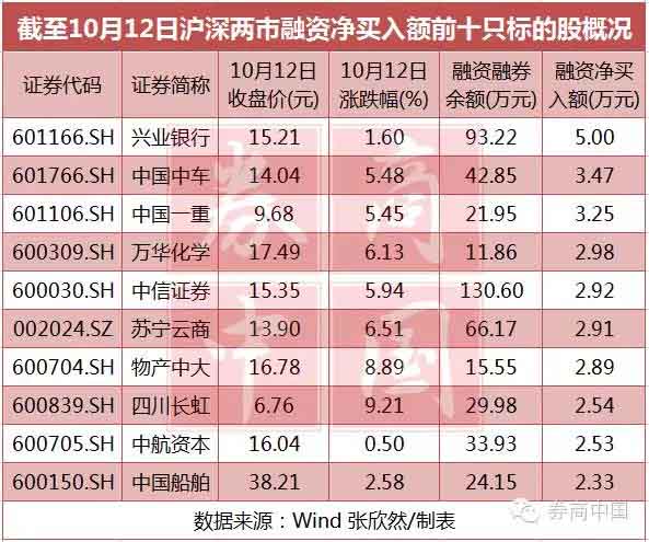 从个券(含ETF)来看,10月12日融资方面,共有818只个券出现融资买入,932只个券出现融资偿还。其中,沪深两市融资买入超过1亿元的品种有384只,排名前五名的是:中国重工12.84亿元、苏宁云商12.77亿元、东方财富11.27亿元、兴业银行10.08亿元、中国中车9.16亿元。而融资净买入额超过1万亿标的股也有68只,排名前五名的是:兴业银行5亿元、中国中车3.47亿元、中国一重3.25亿元、万华化学2.98亿元、中信证券2.91亿元。