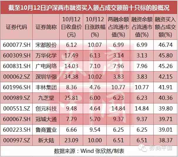此外,券商中国记者在统计中还发现,截至10月12日,有62只标的股融资买入额占成交额30%以上,其中,宋都股份、万华化学、广电网络、深圳华强、丰林集团、九芝堂融资买入额占成交额40%以上。