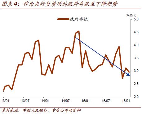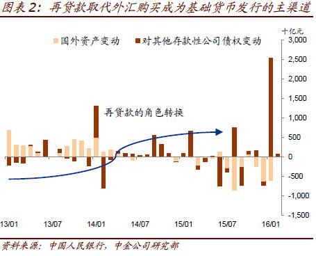 作为央行资产负债表中最主要的负债项目,基础货币从2015 年2 月开始持续下降,至11 月见底。此后,基础货币再次进入扩张通道,今年前两个月增加了1.42 万亿元。基础货币这一规模的增长显然是推动M2 和信贷扩张的主要力量之一。