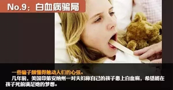 一些骗子颇懂得触动人们的心弦。几年前,美国印第安纳州一对夫妇称自己的孩子患上白血病,希望能在孩子死前满足她的梦想。整个小镇都被调动起来捐款,最后筹集了1.3万美元。