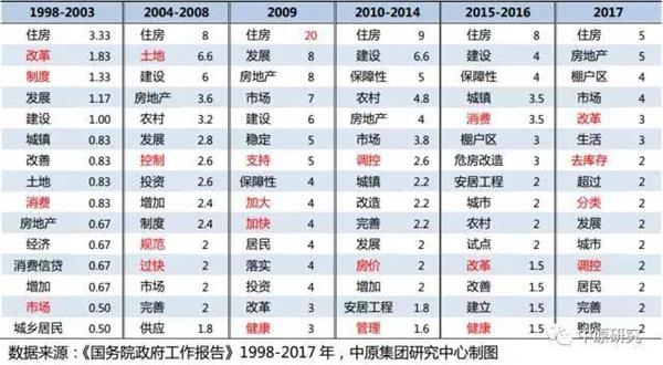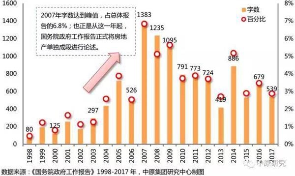 根据中原集团研究中心的研究显示,1998年至2017年的20篇政府工作报告,共37.23万字,关于房地产的部分共1.19万字。