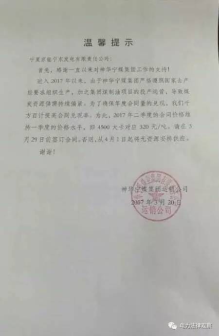 3月20日,神华宁煤向各火电企业发出温馨提示:二季度煤价维持一季度320元/吨,29日前完成合同签订,否则停供。